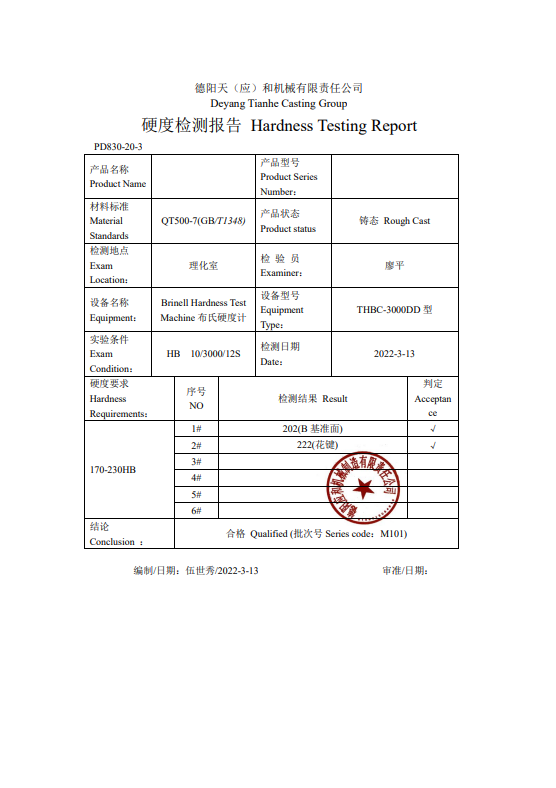 Hardness testing is one of the non-destructive tests performed after die casting, heat treatment, and shoot blasting process to check the properties of cast metals and their suitability in diverse applications. With diverse heat treatment temperatures and material contents, the material is incline to have different hardness. The hardness level would affect a casting part’s strength and wear resistance. In Tianhe Casting, we often use the Brinell hardness test method for our aluminium alloy and iron casting products.