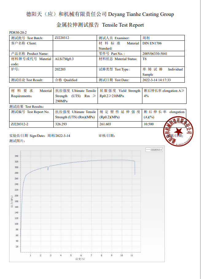 Material strength and ductility change after the casting process, so the tensile test is required to make sure the customer’s standards are met. The quality assurance experts in Tianhe Casting often use the elongation, yield strength, and Ultimate Tensile strength (UTS) test methods to check how strong a material is and how much it can be stretched before it breaks.